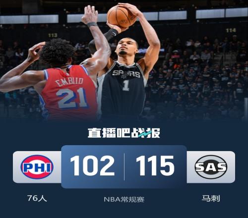 首节开局双方状态相当,前6分钟里双方7次互换领先都占不到便宜,后半节进入轮换阶段76人短暂领先6分的情况下被马刺打出一波7-0的攻势丢掉领先;次节双方延续拉锯模式,后半段马刺逐渐占据上风拉开8分领先,上半场恩比德砍下20分对飚文班亚马17分,不过马刺整体发挥更加出众多打进6记运动战进球并带着7分领先进入下半场。下半场归来文班亚马因为肋骨受伤直接退出比赛,马刺缺少核心的情况下依旧能够掌控局势一直保持领先,整个下半场一直维持着10分上下的领先不给对手机会。最终,马刺主场击退76人拿下比赛。