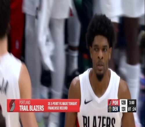 开拓者球员亨德森飙中三分,命中球队本场第25记三分,也是开拓者的球队新高。