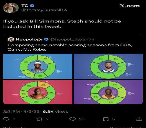 Tommy Gunn还没停。从2022年到现在,这位勇士博主每隔几个月就要把Bill Simmons 2016年的言论翻出来鞭尸——当时Simmons在播客里说,即便库里全票MVP那年,他也从没觉得库里是联盟最佳球员。