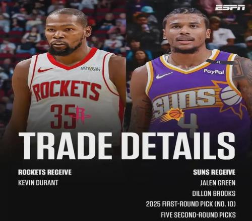 去年夏天休赛期,火箭送出杰伦格林+狄龙+25届首轮第十号签(马卢阿奇)+5个次轮签,从太阳挖来杜兰特。
