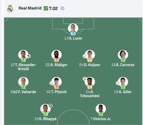 门将方面,诺伊尔全场完成5次扑救,评分7.67;卢宁同样贡献5次扑救,但无力阻止两个丢球。