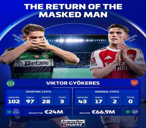 体育播报4月7日宣 阿森纳将在本轮欧冠八强战首回合客战葡体,约克雷斯重逢老东家,《转会市场》也对比了他在两队的数据: