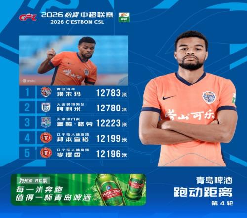 体育播报4月6日宣 今日,中超联赛官方公布了第4轮跑动榜,海牛外援埃朱马连续两轮登顶,本轮他的跑动距离为12783米,英博外援阿利米仅以3米之差列第二位。